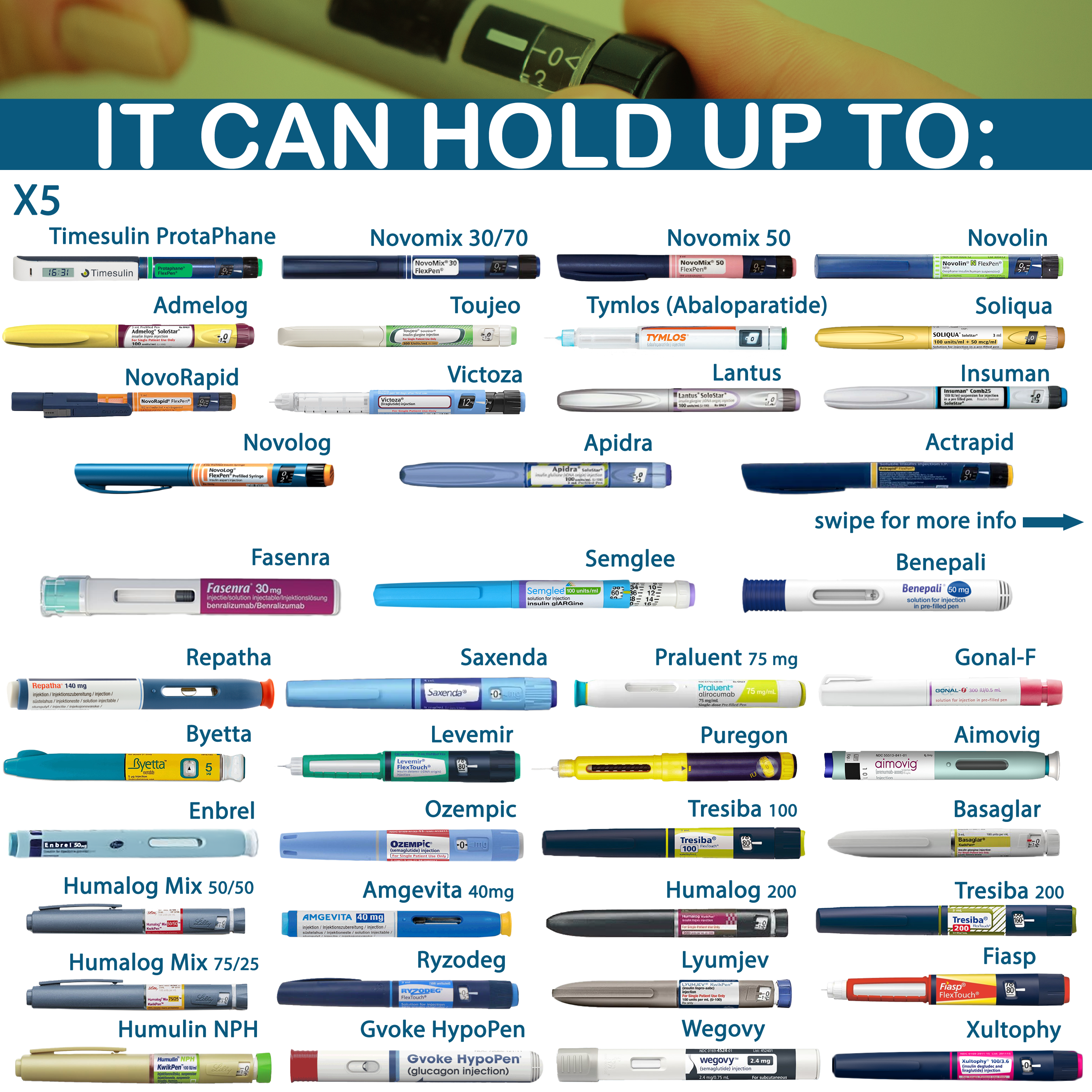 This list is not exhaustive. If your medication or injection device isn’t listed, don’t hesitate to contact us for personalised guidance!