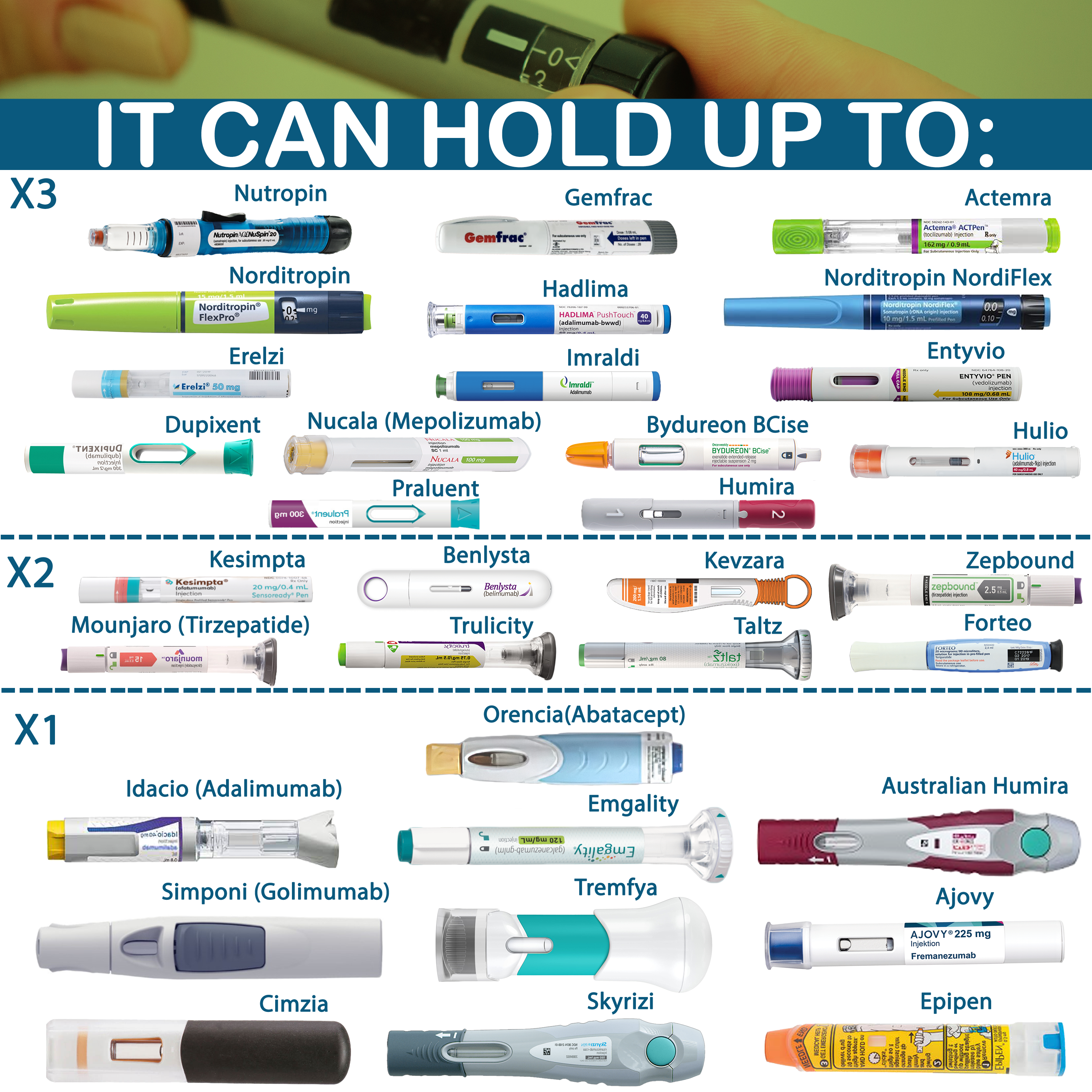 • Up to 3 Injection Pens or Syringes of the following medications: Actemra, Aimovig, Bydureon, Dupixent, Erelzi, Entyvio, Gemfrac, Hulio, Humira pens and