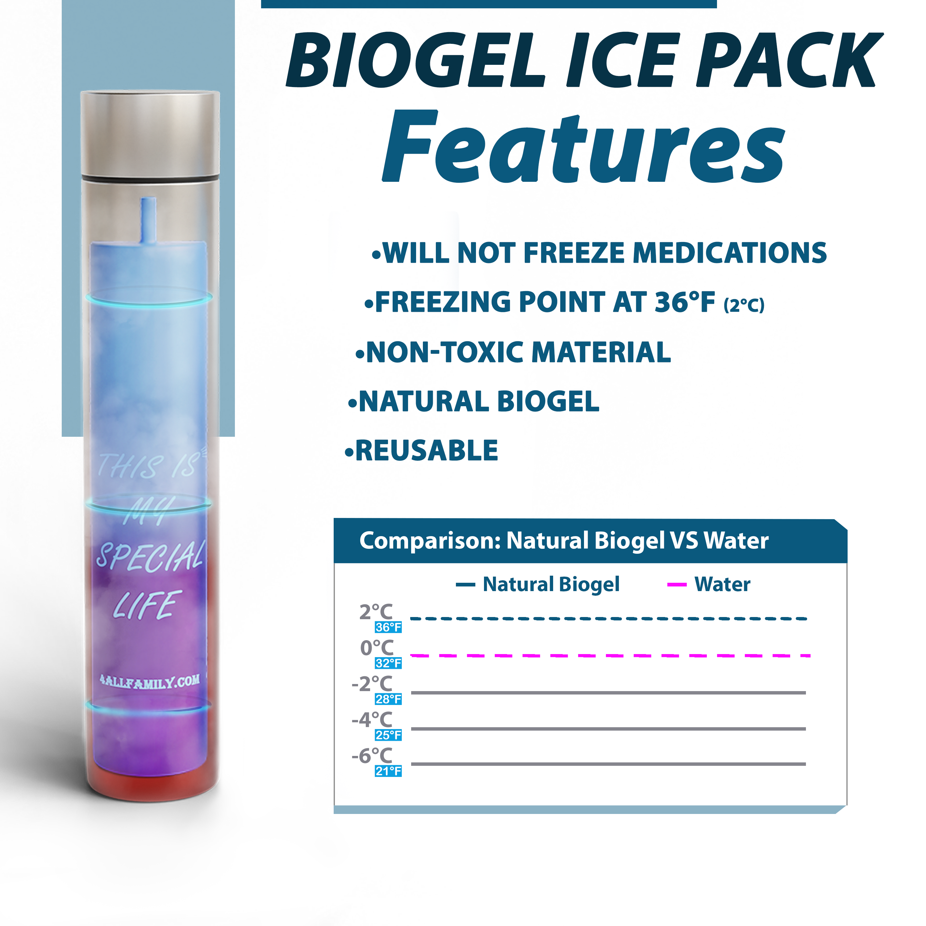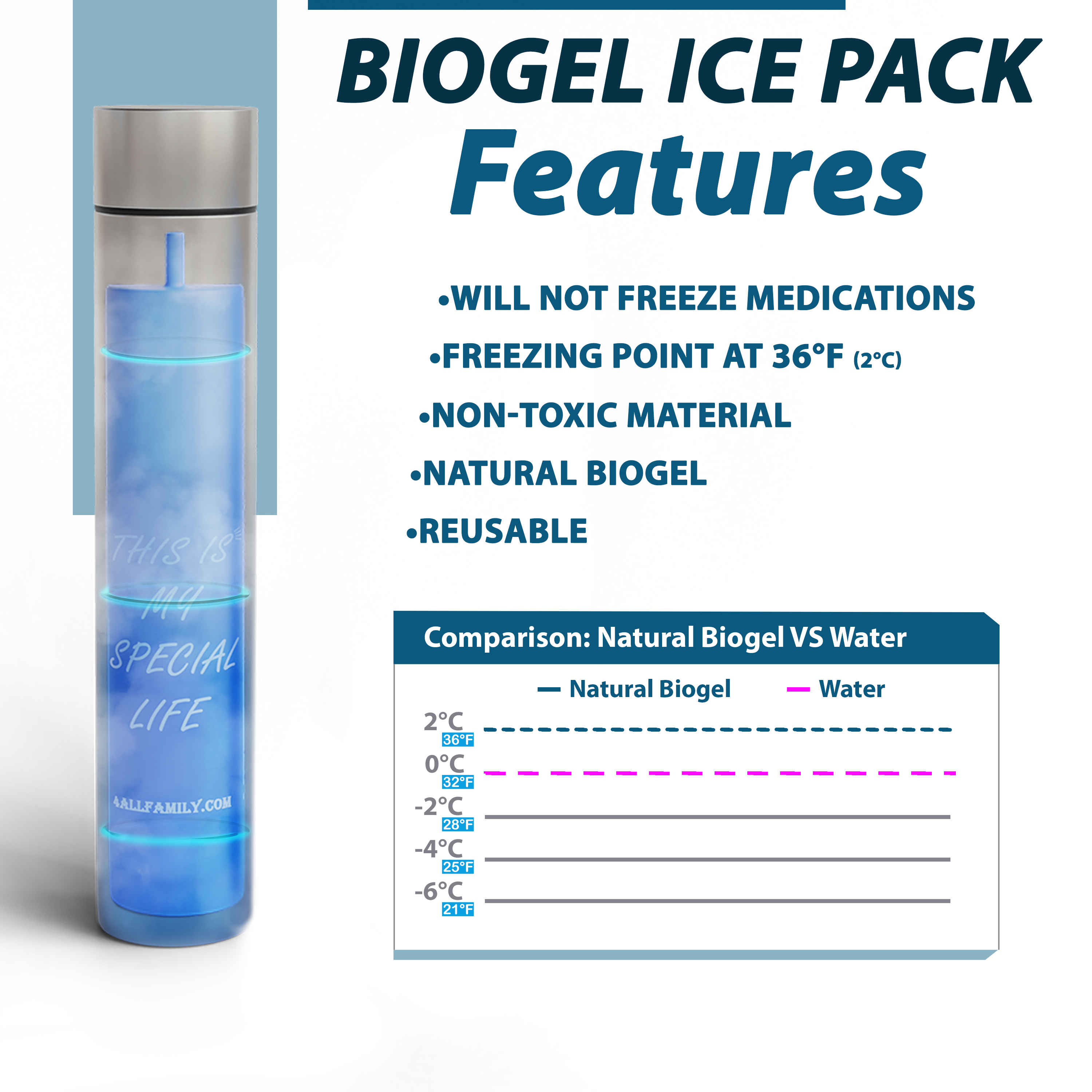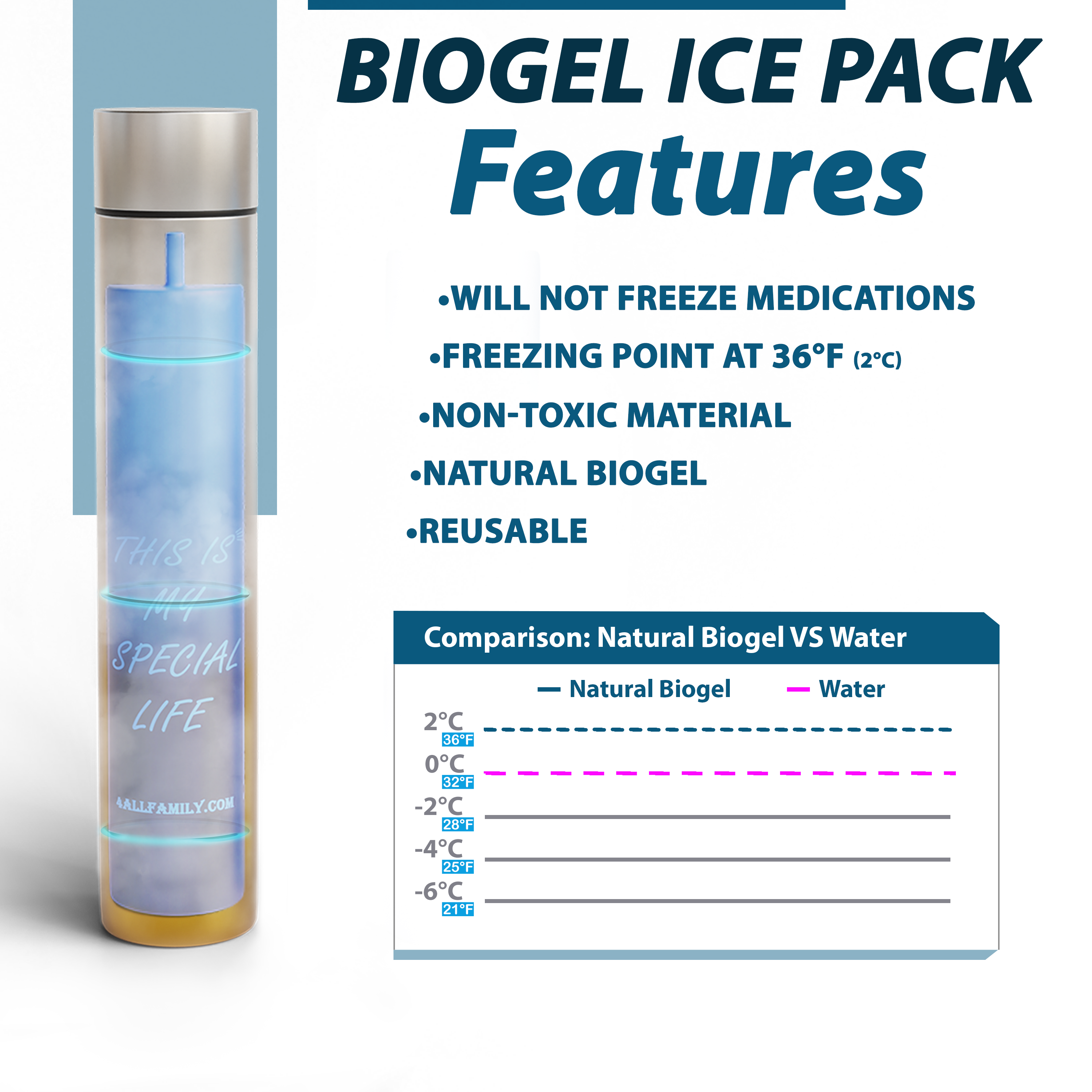 Forget those unreliable lunch bags and ice packs—there’s a better way! The Rambler travel cooler uses an innovative Biogel cooling pack that’s designed with advanced anti-freeze protection. The Biogel freezes at a safe 2°C, well above the freezing point of insulin and other injectable medications, ensuring your meds stay cool without the risk of freezing.