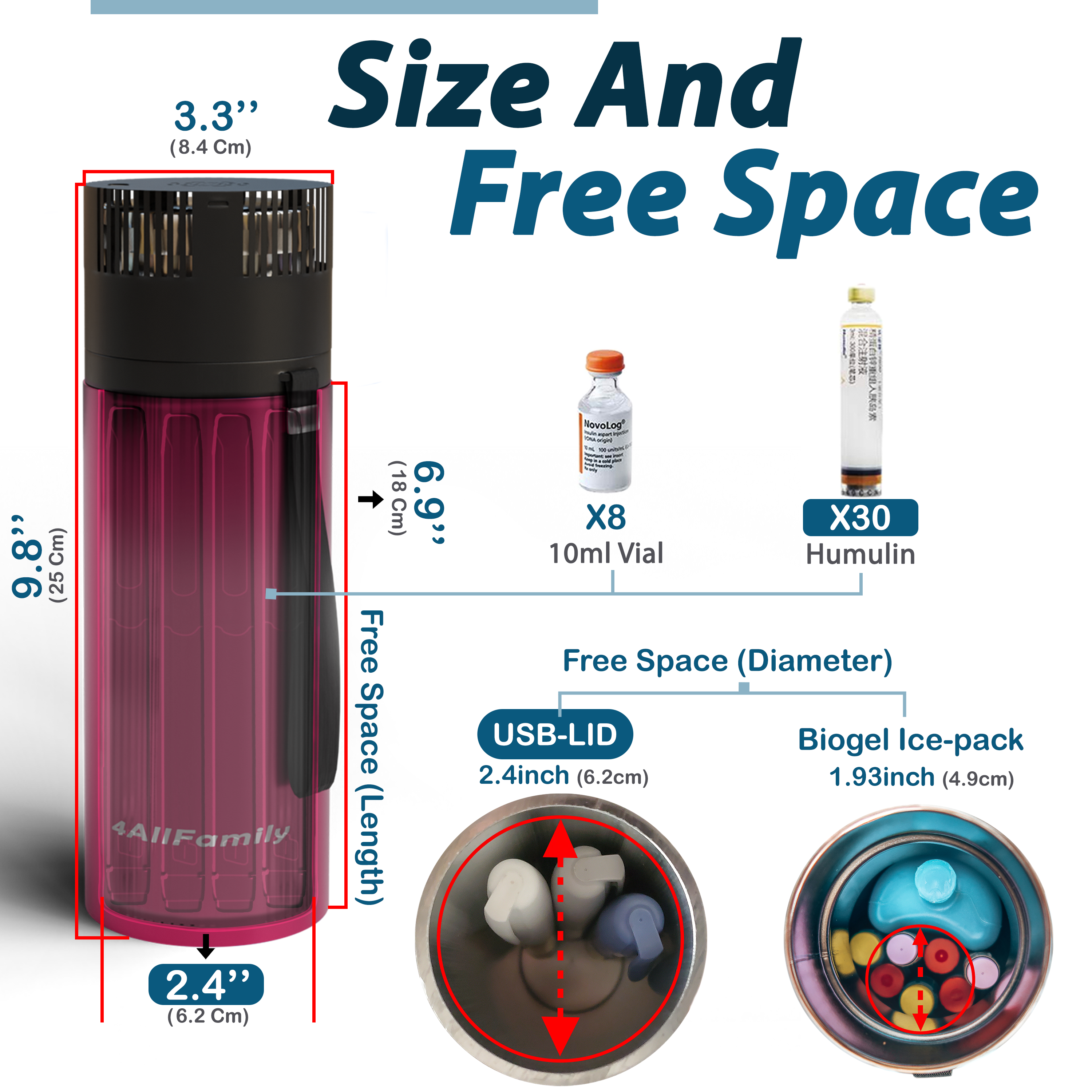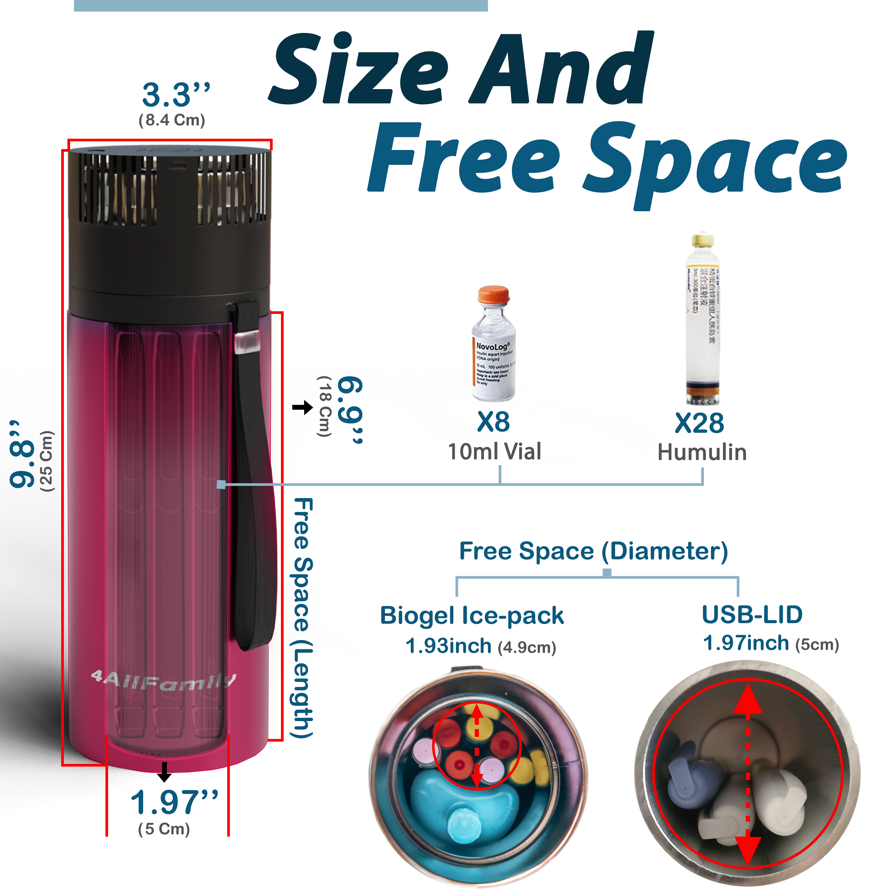 • Mini fridge dimensions: 8.4 cm diameter (3.3”), 24.9 cm height (9.8’’) when used with the USB-LID and 22.6 cm height (8.9’’) when used with the normal stainless steel lid