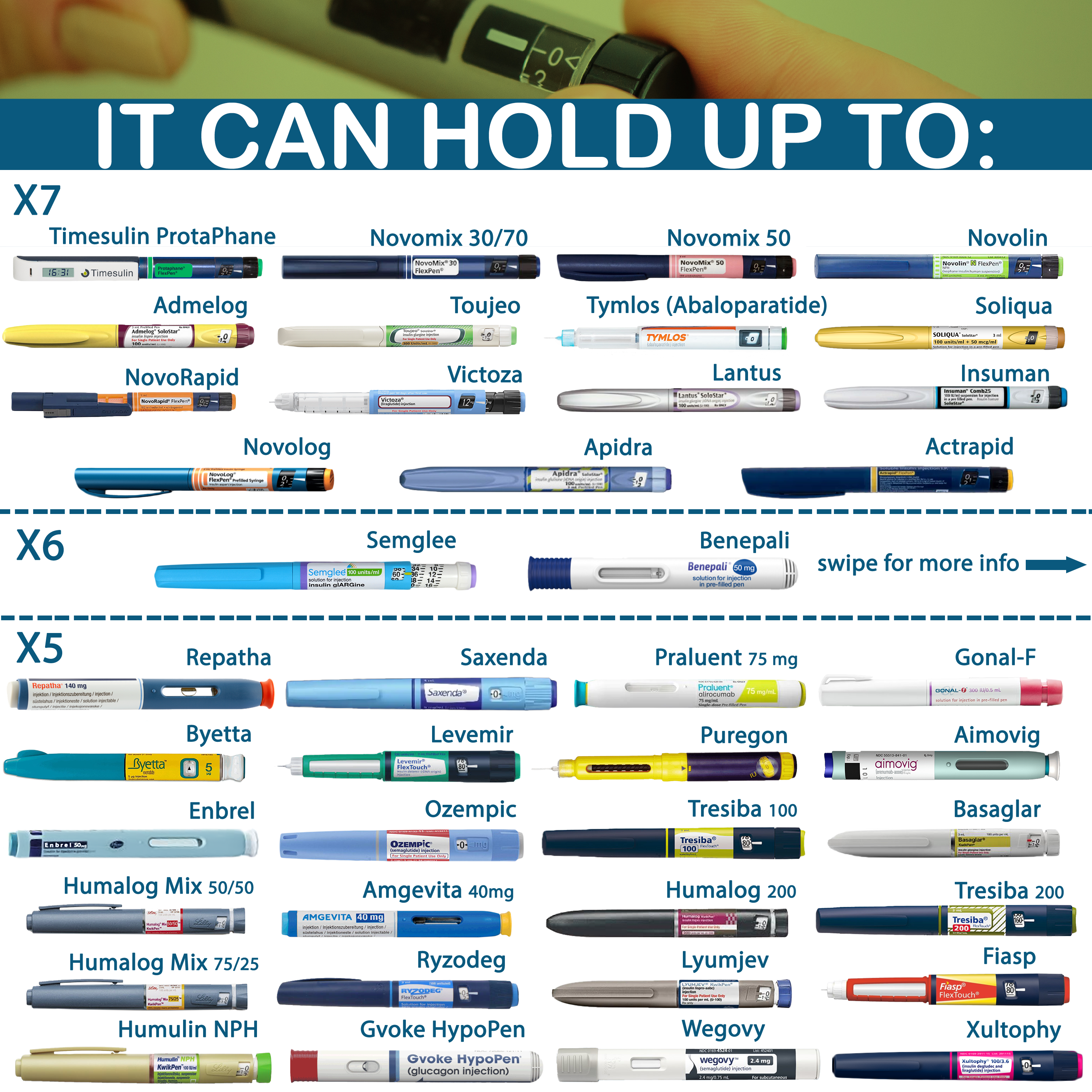 This list is not exhaustive. For more information on specific medicine or injection device compatibility, please refer to the product images or contact us directly for personalised guidance.