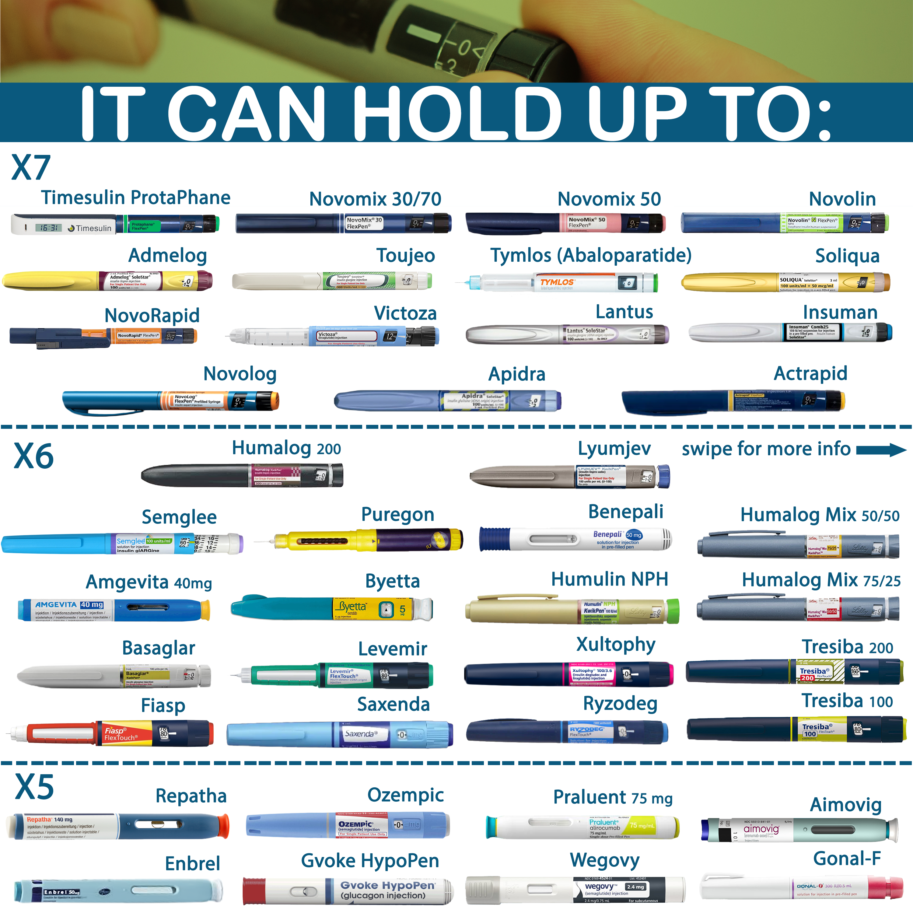 • 7 units of Lantus pens, NovoRapid pens, Insuman pens, Soliqua pens, Apidra pens, Toujeo pens, Admelog pens, NovoMix pens, Trimix vials.